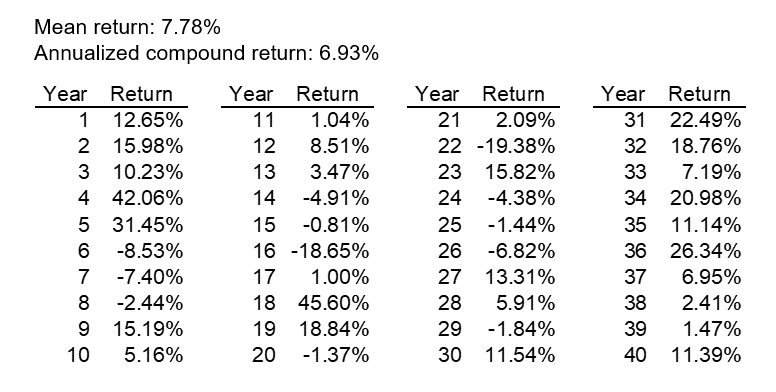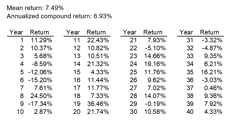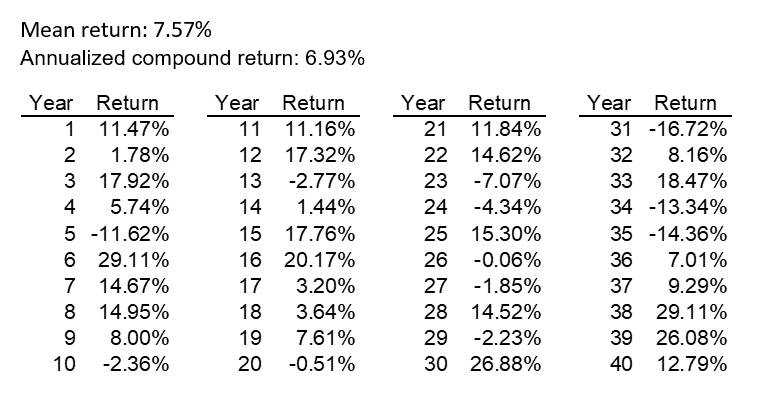 We generated 1,000 scenarios. The median annualized compound return over the 40-year period is 6.93%. The mean annualized compound return over the 40-year period is 7.00%.