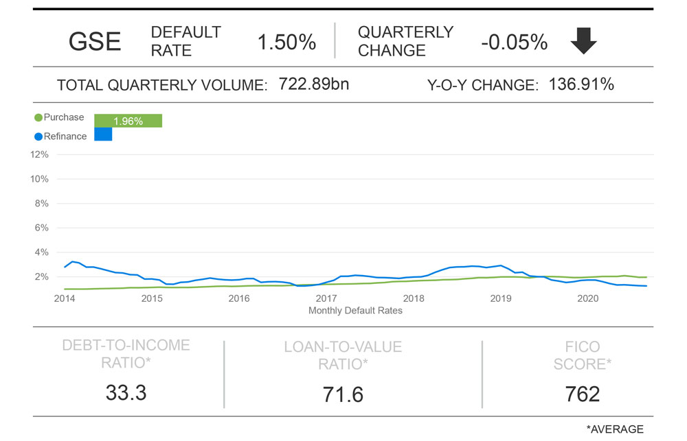 Mortgage demand remained strong during the third quarter (Q3) of 2020, with Freddie Mac and Fannie Mae mortgage volume increasing more than 125% year-over-year and hitting record volume. Concurrent with the increased mortgage volume, the default risk of mortgages continued to decline year-over-year and quarter-over-quarter as interest rates also declined and home prices continued to grow.