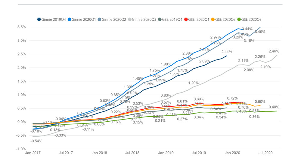 When reviewing quarter-over-quarter changes in the MMDI, it is important to note that the 2020 Q2 MMDI values for GSE and Ginnie Mae acquisitions have been restated since the last publication, changing from 1.74% to 1.54% and 10.61% to 8.99%, respectively. This is a result of updating actual home price movements from forecasted values and updating home price appreciation forecasts with the most recent forecasts available. Since the start of the pandemic-induced shutdowns (March 2020), actual home price appreciation has exceeded expectations, resulting in consecutively lower restated values of the MMDI.