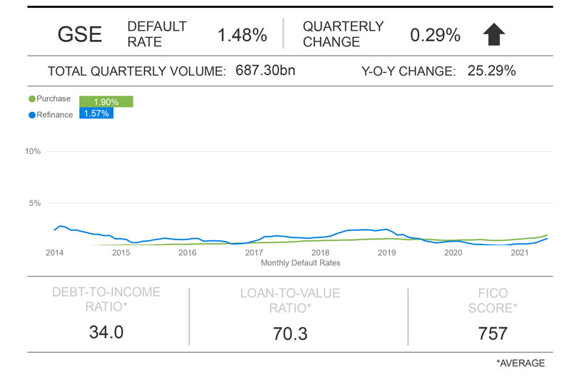 Largely driven by the decrease in refinance loans, the total default risk quarter-over-quarter for government-sponsored enterprise (GSE) acquisitions during Q2 2021—loans acquired by Freddie Mac and Fannie Mae—increased 1.48% for loans originated in Q2 2021 compared to the 1.20% increase for loans originated in Q1 2021. Figure 1 provides the quarter-end index results for these loans segmented by purchase and refinance.