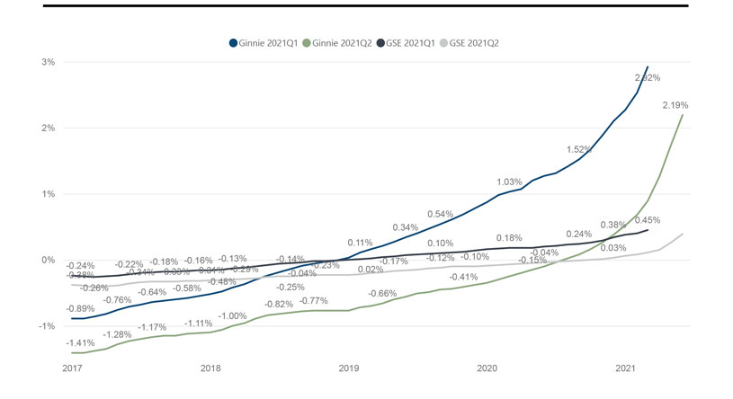 For GSE loans, borrower risk increased from 1.03% in Q1 2021 to 1.17% in Q2 2021. The main driver of the increase is the combination of lower average credit scores and slightly higher loan-to-value ratios. For Ginnie Mae loans, borrower risk increased in Q2 2021 relative to Q1 2020 from an average of 6.11% to 6.47%. Ginnie Mae loans generally have a lower credit score and higher loan-to-value ratio.