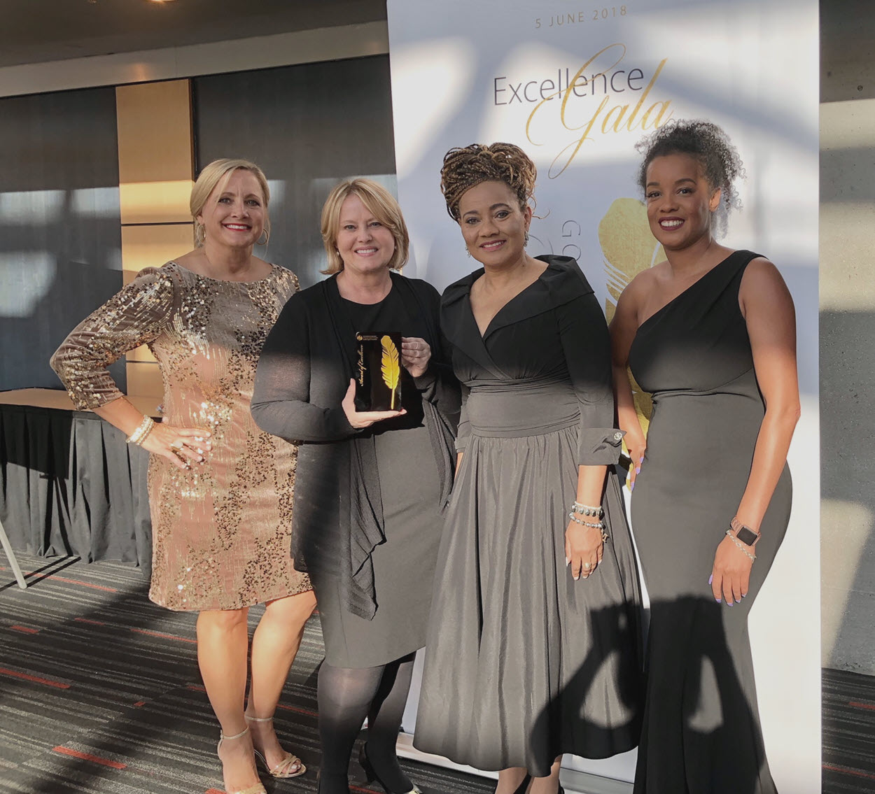 Milliman's Julie Cannaday with client Southern Glazer's Wine & Spirits HR leaders Michelle Toney, Margaret Walker and Nicole Boyd (from left) accept the 2018 Gold Quill Award of Excellence in Human Resources & Benefits Communication at the International Association of Business Communicators (IABC) Excellence Gala in Montreal.