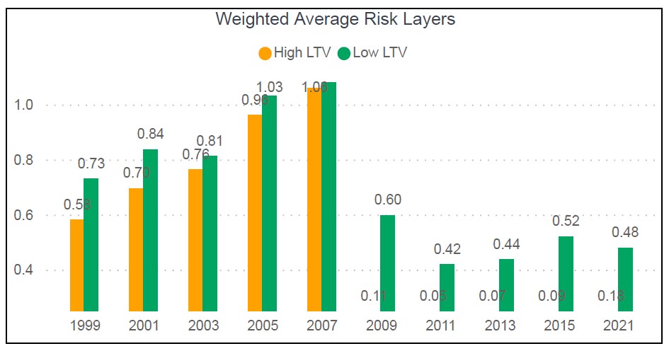 Following the global financial crisis, there was a broad objective to reduce what is known as risk layering. For example, assume there are six indicators of a high-risk loan: (1) the LTV is greater than 80%, (2) the credit score is less than 680, (3) the DTI ratio is greater than 45%, (4) the loan purpose is a cash-out refinance, (5) the property is a multiunit property, and (6) the loan is for an investment property. If a loan has all six of these characteristics, it is said to have six risk layers. The more risk layers, the higher the risk of default. Figure 5 shows the weighted average risk layer by year broken out by high and low LTV. From this chart, we see a dramatic reduction in risk for both high and low LTV loans as a result of tighter underwriting standards. In 2007, the average loan had at least one risk factor. From 2009 onward, the average risk factor decreased and stayed below historical averages.