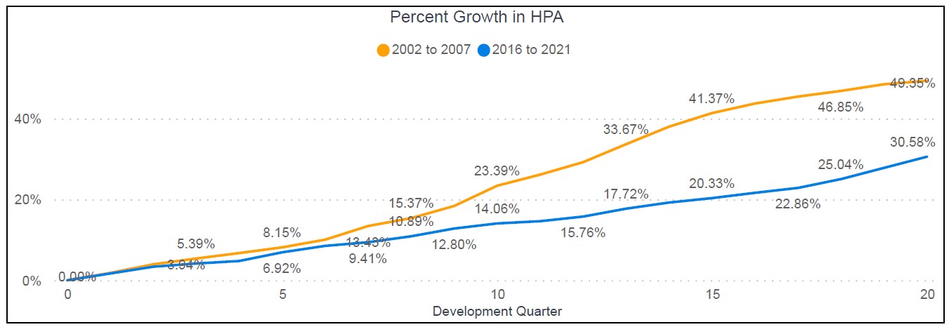 The above charts take the growth development of HPA from 2002Q1 through 2007Q2 and 2016Q1 through 2021Q2 respectively. For example, the HPA growth at development month 15 takes the HPA from 2005Q4 over the values from 2002Q1 and 2019Q4 values over 2016Q1 values.