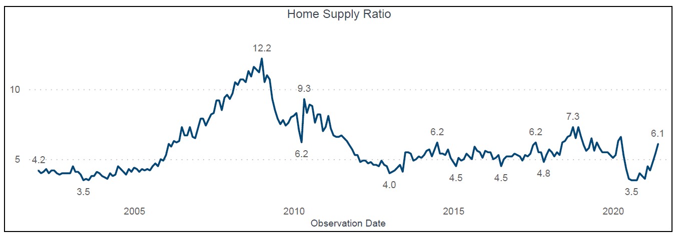 Another often-discussed driver of recent home price appreciation is the current constraint on the supply of homes available for sale in the market. Figure 8 shows the home supply index as provided by the U.S. Census Bureau and U.S. Department of Housing and Urban Development.6 The months of supply ratio is defined as: “the ratio of houses for sale to houses sold. This statistic provides an indication of the for-sale inventory in relation to the number of houses currently being sold. The months’ supply indicates how long the current for-sale inventory would last given the current sales rate if no additional new houses were built.” The months of supply ratio on June 1, 2007, was 8.2; meaning that if no further homes were built, based on the current demand, the supply would last 8.2 months. In June 2021, the supply ratio was just 6.1, and this is an increase from just 3.5 in 2020. Because of the lower supply ratio, we would expect home prices to naturally rise in 2021.