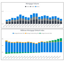 The Milliman Mortgage Default Index (MMDI) uses econometric modeling to develop a dynamic model that is used by clients in multiple ways, including analyzing, monitoring, and ranking the credit quality of new production, allocating servicing sources, and developing underwriting guidelines and pricing. Because the MMDI produces a lifetime default rate estimate at the loan level, it is used by clients as a benchmarking tool in origination and servicing. The MMDI is constructed by combining three important components of mortgage risk: borrower credit quality, underwriting characteristics of the mortgage, and the economic environment presented to the mortgage. The MMDI uses a robust data set of over 30 million mortgage loans, which is updated frequently to ensure it maintains the highest level of accuracy.