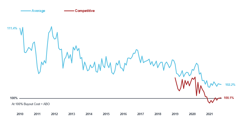 During August 2021, average accounting discount rates increased by 7 basis points (bps), while annuity purchase rates increased by 7 bps (average) and 6 bps (competitive). This caused the average estimated retiree buyout cost as a percentage of accounting liability (accumulated benefit obligation) to stay nearly flat (decreased from 102.3% to 102.2%). Likewise, the competitive pricing trend remained level at 100.1%.