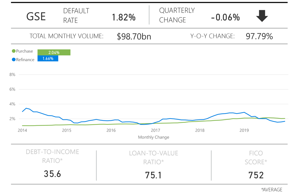 During the fourth quarter of 2019, the MMDI for government-sponsored enterprise (GSE) acquisitions (loans acquired by Freddie Mac and Fannie Mae) decreased, lowering from 1.88% in Q3 to 1.82% for loans originating in Q4. Figure 1 provides the quarter-end index results for these loans segmented by purchase and refinance. This quarter continues the trend of declining risk that persists from 2018 Q4 through 2019 Q4 primarily due to low-risk refinance borrowers once again taking advantage of the drop in interest rates.