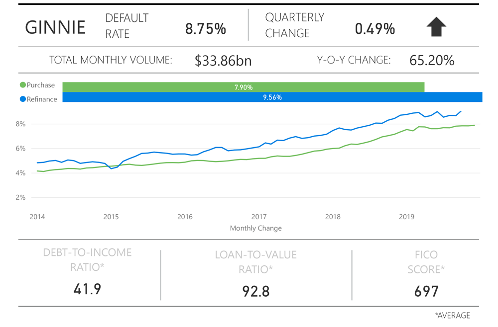 Loans guaranteed by Ginnie Mae experienced an increase in their default risk in 2019 Q4, driven mainly by increased economic uncertainty. Of the Ginnie Mae loans originated during this time period, 66% were purchase loans. For the remaining refinance loans, many were originated through streamlined refinance programs, where a credit score is not provided. These loans are conservatively assigned a credit score of 600 in the index, which increases borrower default risk during heavy refinance periods for FHA and VA.