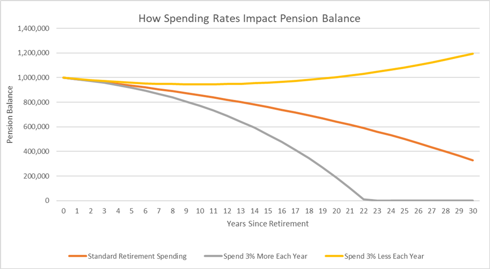 Figure 2: How spending rates impact pension balance in a market crash scenario